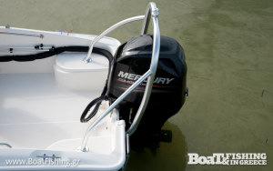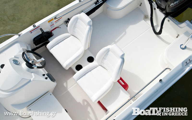 Στην πλώρη, τα ρέλια είναι τοποθετηµένα περιµετρικά για την ασφάλεια του πληρώµατος, ενώ αν θα παρατηρήσετε, υπάρχουν χαµηλά ρέλια εσωτερικά και του υπόλοιπου σκάφους , όπου προσφέρουν κράτηµα χωρίς να εµποδίζουν στο ψάρεµα ή τη µετακίνηση. Πίσω από την κονσόλα διαµορφώνεται ένας πάγκος, στον οποίο στηρίζονται δύο καθίσµατα. Κάτω από αυτόν έχουµε ελεύθερο χώρο για να τοποθετήσουµε δοχείο καυσίµου ή ότι άλλο θέλουµε.