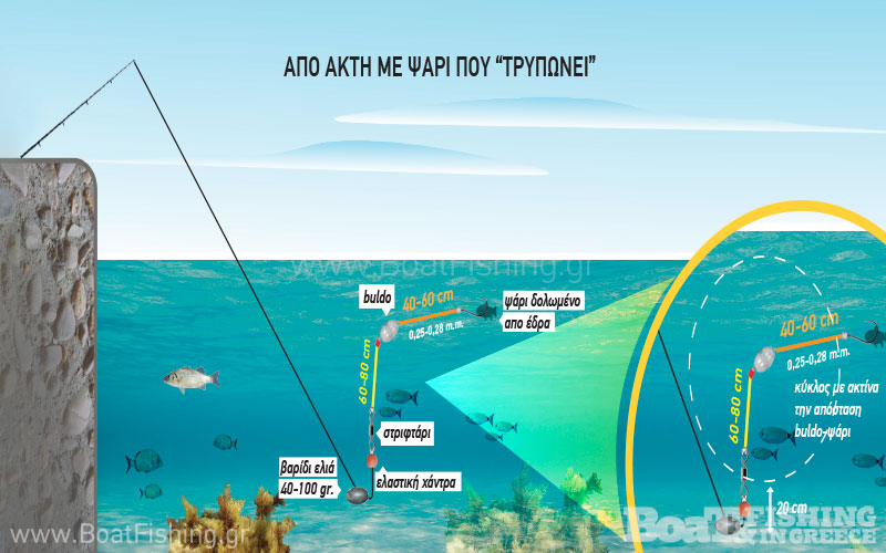 Μικρές λίτσες, κέφαλοι, µουρµούρες, σάλπες, σπάροι κλπ. πιασµένα µε πολυάγκιστρο αφρού, µπορούν να αναζητήσουν τα λαβράκια από την ακτή µε µεγάλη επιτυχία και αρκετά συχνές συλλήψεις, ειδικά την περίοδο Νοεµβρίου-Φεβρουαρίου που τα ψάρια κορυφώνουν την αναπαραγωγική τους δραστηριότητα και αναζητούν εναγωνίως πρωτεΐνη για να µεγαλώσουν τα αυγά τους. Δεξιά: Κέφαλος δολωµένος από τη ράχη, πριν πέσει στο νερό προς αναζήτηση ενός µεγάλου θηρευτή.