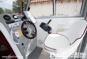 Η είσοδος στο πιλοτήριο γίνεται από τα αριστερά της καµπίνας, ανοίγοντας τη συρόµενη αλουµινένια πόρτα. Ο χώρος είναι ιδιαίτερα ευρύχωρος και διαθέτει σωστή ορατότητα περιµετρικά του σκάφους. Πίσω από το κάθισµα διακυβέρνησης υπάρχει νεροχύτης ενώ στην απέναντι πλευρά υπάρχει ένας πάγκος – κάθισµα για τον συγκυβερνήτη. Το τιµόνι, το χειριστήριο και τα όργανα του κινητήρα είναι άψογα τοποθετηµένα µπροστά από τον χειριστή, και η ορατότητα σωστή ακόµα και όταν κάθεται. Η καµπίνα ύπνου µε κλασική διαρρύθµιση καναπέ Π µε τη δυνατότητα φυσικά να «κλείσει» δηµιουργώντας ένα µεγάλο κρεβάτι. Τα µαξιλάρια από κάτω τους κρύβουν ευρύχωρα αµπάρια και στα πλάγια διαµορφώνονται χρήσιµα βοηθητικά ράφια αποθήκευσης.