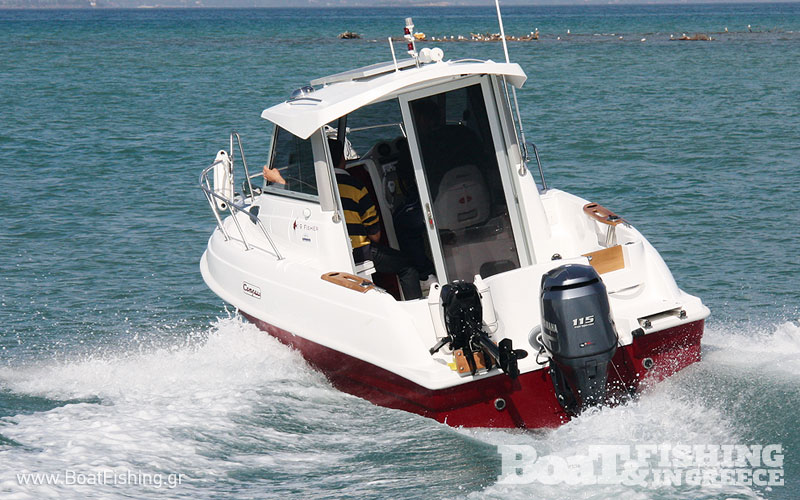 Αυτό που µου έκανε εντύπωση µπαίνοντας στο σκάφος ήταν η ευστάθεια που διαθέτει, ένα δύσκολο «στοίχηµα» αν λάβουµε υπόψη την υπερκατασκευή της πιλοτίνας όπου ανεβάζει το κέντρο βάρους ψηλότερα από ένα άλλο ανοιχτό σκάφος. Όµως στην πράξη δεν αντιµετώπιζε κανένα θέµα. Στον καρθέπτη του 19 Fisher υπήρχε τοποθετηµένος ένας Yamaha F 115 Hp µε προπέλα 4φτερη 17’’.