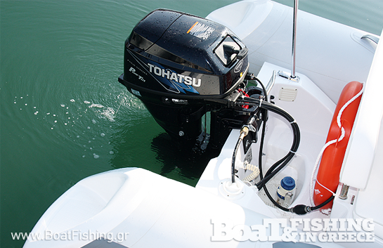 Στο καθρέπτη µπορούµε να τοποθετήσουµε εξωλέµβια κοντού άξονα από 10 ως 30 ίππους. Ο 20αρης της Tohatsu ήταν στην πράξη αρκετός για να ταξιδέψουµε σωστά ενώ σύµφωνα µε την εταιρία η σχεδίαση της γάστρας επιτρέπει το πλανάρισµα ακόµα και µε 10 ή 15 ίππους κινητήρα αφού είναι ιδιαίτερα ελαφρύ, 110 κιλά.