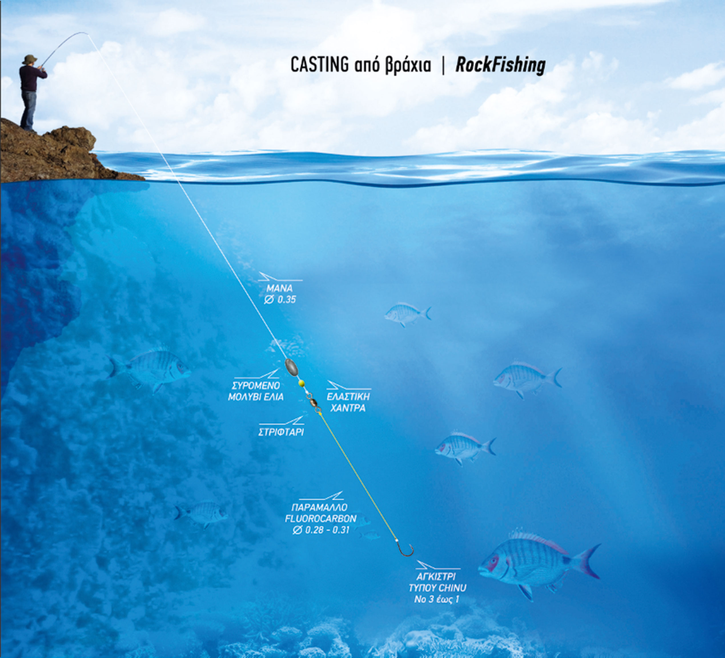Αν θέλουµε κοντινή απόσταση σε οµαλό βυθό, πάλι το εγγέζικο θα δώσει τη λύση, όµως όταν τα ψάρια τρώνε σε απόσταση και σε δύσκολους βυθούς, το ψάρεµα µε δυνατό casting εξοπλισµό είναι µονόδροµος. Μάλιστα καλό είναι να έχουµε καλάµια µε σκληρό κορµό και δράση κορυφής, µε c.w ως 150 ή ακόµα και 200gr.