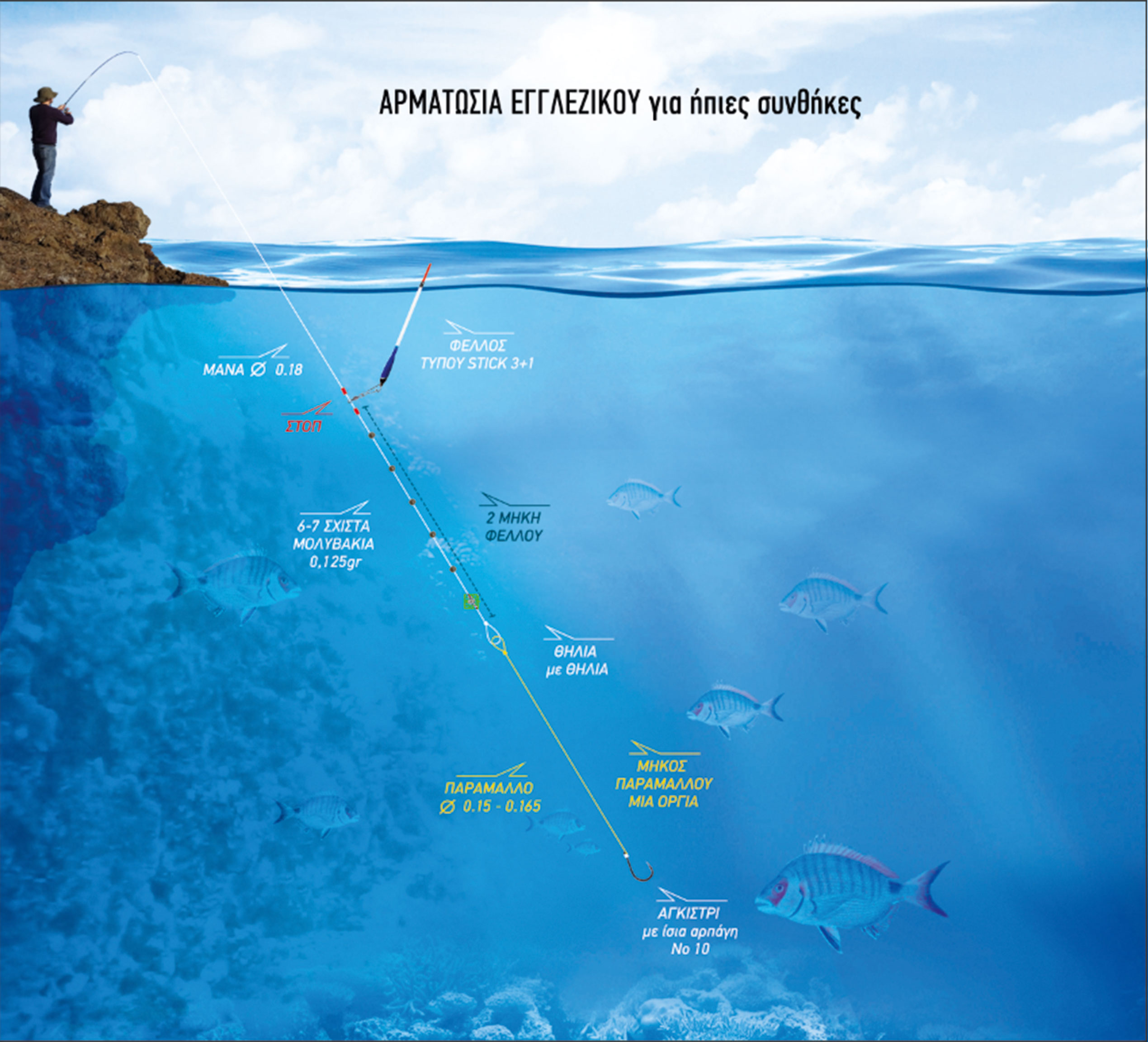 Μονάγκιστρη αρµατωσιά, ελεύθερη µε ένα στριφτάρι στη µάνα και τίποτα άλλο. Στα µέρη που τα µικρά βάθη ανεβοκατεβαίνουν, ξεπροβάλλουν βραχάκια, υπάρχουν κάθε λογής µαγκώµατα στο βυθό, το ελεύθερο ψάρεµα µε ένα δίσπαστο ελαφρύ σπινοκάλαµο 7-23 ή 5-25gr. µήκους 2.7 µέτρων, θα µας απελευθερώσει από αξεπέραστες δυσκολίες.