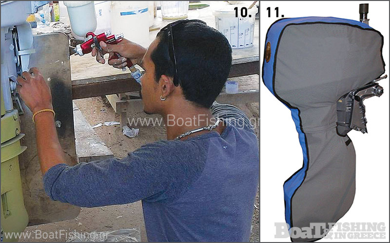Οι σηµερινοί εξωλέµβιοι διαθέτουν πολυστρωµατική βαφή και ειδικές επιστρώσεις στο γυµνό αλουµίνιο του κινητήρα, του µεσαίου τµήµατος (κορµός) και του ποδιού. Κατά συνέπεια όταν γδαρθεί αυτή η βαφή απαιτείται άµεση επισκευή ειδικά στην περιοχή του ποδιού το οποίο εργάζεται συνεχώς εντός του αλµυρού νερού. Εάν δεν βαφτεί η όποια γδαρµένη επιφάνεια οπουδήποτε στον κινητήρα τότε γρήγορα εκεί θα εµφανιστεί περαιτέρω φθορά και διάβρωση (Φωτ.8). Όλοι οι πάγκοι ανταλλακτικών των εταιρειών διαθέτουν σε σπρέι (Φωτ.9) τα χρώµατα όλων των µοντέλων και µε λίγη προσοχή, τρίβοντας µε λεπτό γυαλόχαρτο τοπικά και µε χαρτί µασκαρίσµατος µπορείτε να δηµιουργήσετε ένα πολύ καλό αποτέλεσµα. Εάν η ζηµιά είναι βαθύτερη και έχει φανεί γυµνό µέταλλο τότε θα απαιτηθεί πρώτα ένα στρώµα προεργασίας (primer-πράϊµερ) πριν την τελική βαφή. Γι αυτούς που επιθυµούν µία ολική βαφή µπορεί να το επιτύχουν εάν έχουν µεράκι και τα σχετικά εργαλεία ή ως εναλλακτική λύση να το αφήσουν στα χέρια ενός έµπειρου επαγγελµατία (Φωτ.10).