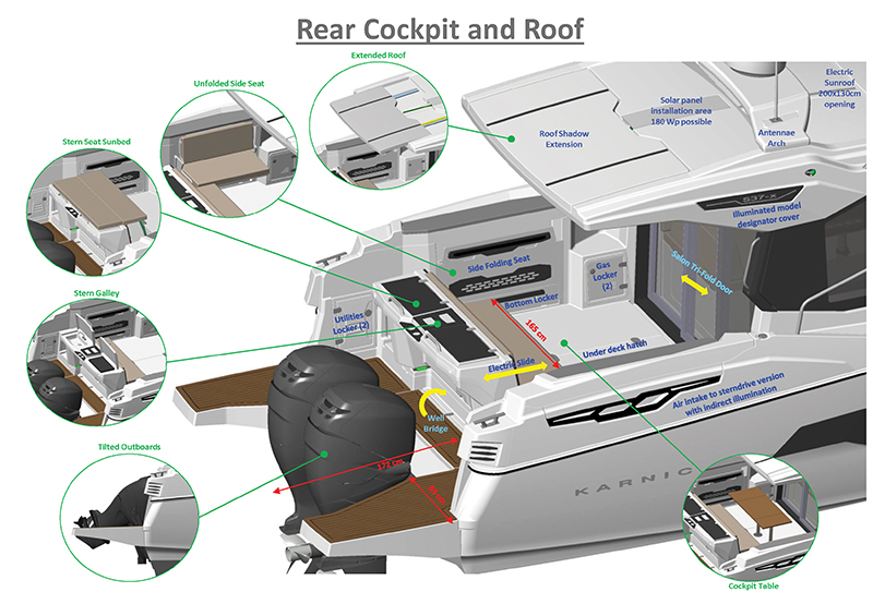 Έξω υπάρχουν πολλοί χώροι αποθήκευσης, κάτω από τους καναπέδες, στα πλαϊνά ακόμα και κάτω από το ντεκ. Το wet bar που βρίσκεται ακριβώς από πίσω κινείται ηλεκτρικά μπρος-πίσω για να εξοικονομείται χώρος και ο καναπές γίνεται μία ευρύχωρη ξαπλώστρα σκεπάζοντάς το.