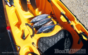 surth-afrou_4Συµπερασµατικά, µία βόλτα µε kayak µπορεί κάλλιστα να µετατραπεί σε µία αποδοτική ψαρευτική εξόρµηση, φτάνει να έχουµε µαζί µας ένα ή δύο καλάµια και τις αντίστοιχες καλαµοθήκες στο σκαφάκι µας. Οι –συνήθως- ενσωµατωµένες στην πρύµνη του σκάφους µας καλαµοθήκες, αρκετές φορές δεν είναι εύκολο να παρακολουθούνται καθώς κωπηλατούµε. Έτσι, ένας εύκολος τρόπος για να καταλάβουµε ότι πήραµε τσιµπιά, είναι να λύσουµε τα φρένα του µηχανισµού µέχρι να µην ξετυλίγεται πετονιά καθώς σύρουµε το τεχνητό, µε σκοπό να ακούσουµε το χαρακτηριστικό ήχο µόνο όταν «χτυπήσει» το ψάρι και πάρει φρένα. Άλλος ένας τρόπος είναι να προσθέσουµε µία καλαµοθήκη µπροστά, µε µεγαλύτερη κλίση προς την θάλασσα, όπου καθώς πλέουµε η ορατότητα είναι άµεση. Θέλει όµως µία σωστή «µελέτη» πριν την τοποθέτηση, ώστε το καλάµι και η πετονιά να µην µπερδεύονται ή εµποδίζουν κατά την κωπηλασία.