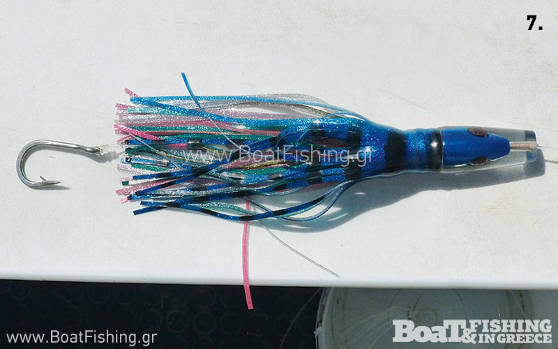 Ίδια περίπτωση και στη φωτογραφία 6: εδώ το µεγάλο αγκίστρι που δεν ήταν κυκλικό αλλά ίσιο, απέτυχε να καρφώσει το ψάρι. Τη δουλειά του, την ανέλαβε το κυκλικό συρόµενο, το οποίο παρότι µικρότερο, καρφώθηκε σωστά και έφερε το ψάρι στη βάρκα.
