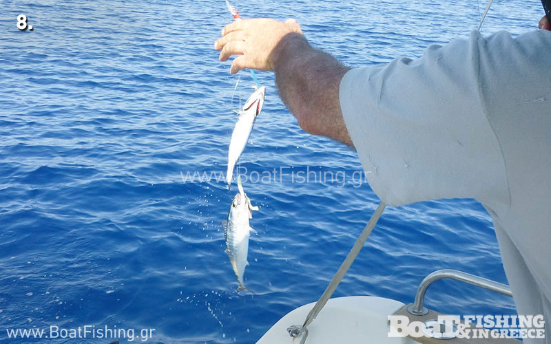 Πάντα µακρυκότσανα, ίσια αγκίστρια και µάλιστα αρκετά µεγάλου µεγέθους, έστω και αν στοχεύουµε σε σχετικά µικρά θηράµατα. Στη φωτογραφία 8, φαίνεται καθαρά η λειτουργία των µακρυκότσανων αγκιστριών που βρέθηκαν στο στόµα των δύο παλαµίδων. Το σχετικά µεγάλο µέγεθος των αγκιστριών, βοήθησε στο σωστό κάρφωµα των ψαριών και στο σταθερό τους ανέβασµα στη βάρκα.