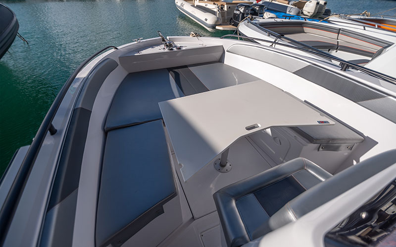 Ο άνετος καναπές της πλώρης προσφέρει µεγάλη ξαπλώστρα µε ποιοτικές ταπετσαρίες αλλά και χώρο για να γευµατίσουµε µε την προσθήκη του τραπεζιού.