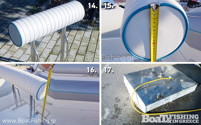Οι σωλήνες του καθίσµατος έγιναν στις διαστάσεις των Φ40 για τους κύριους σωλήνες και Φ20 για τον βοηθητικό σωλήνα αντιστήριξης. Στη βάση του καθίσµατος τοποθετήθηκαν πλάκες περίπου 30 εκ. µήκους και 5 εκ. πλάτους και ανοίχτηκαν οπές µε φρέζα ώστε οι βίδες να µην προεξέχουν καθόλου κατά την τοποθέτηση του καθίσµατος στο ντεκ.