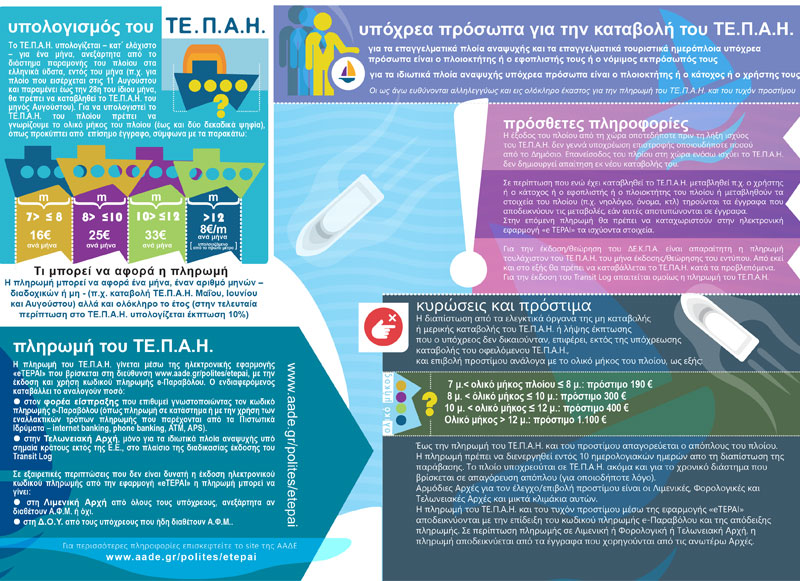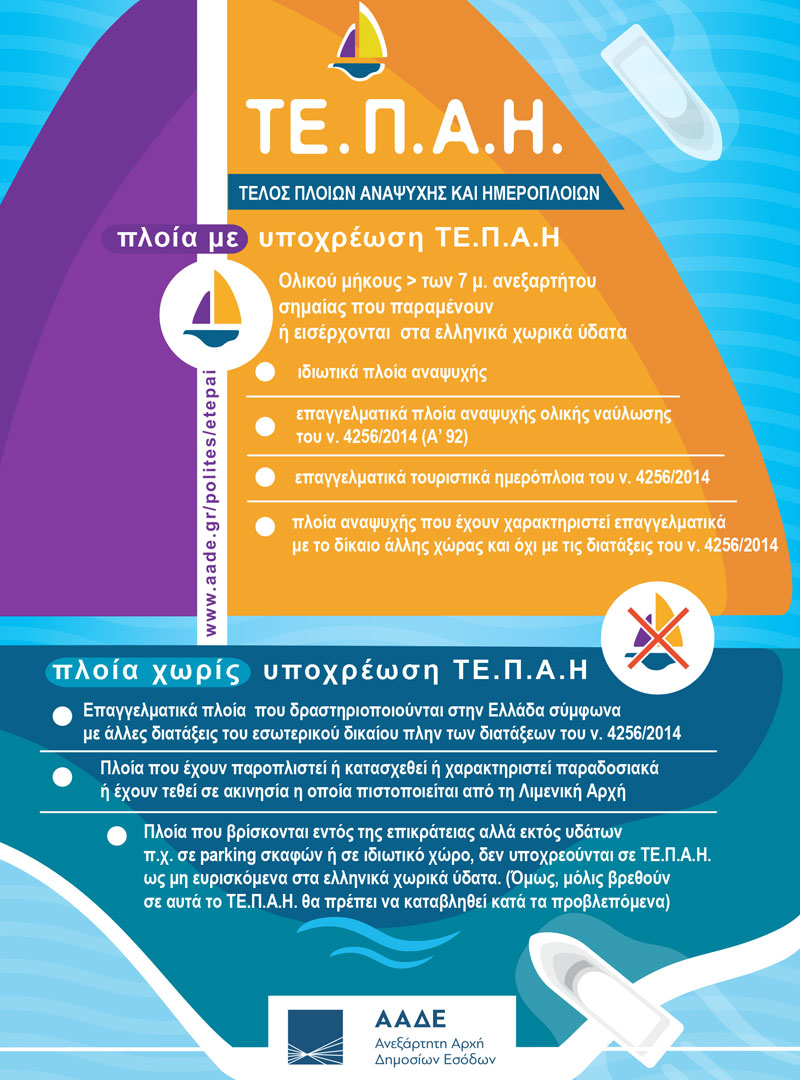 Από 9 Μαΐου 2019 τίθεται σε ισχύ το νέο «Τέλος Κυκλοφορίας Σκαφών» γνωστό ως Τέλος Πλοίων Αναψυχής και Ημερόπλοιων (ΤΕΠΑΗ).