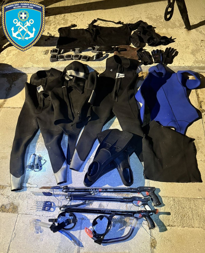 Μέσα στο σκάφος βρέθηκαν και κατασχέθηκαν στολές κατάδυσης, βαρίδια, μάσκες, φακοί, βατραχοπέδιλα και ψαροντούφεκα.