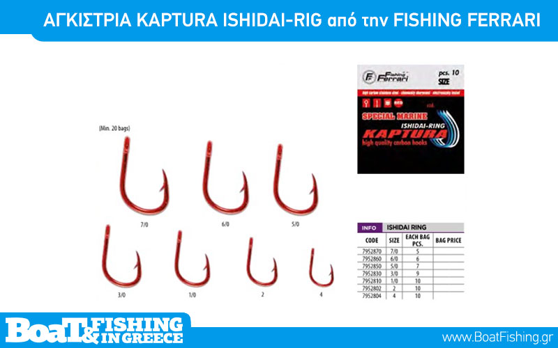 Η Fishing Ferrari, εταιρία της Linea Effe, προτείνει τα Kaptura Ishidai-Ring. Πρόκειται για αγκίστρια µε µεγάλη καµπύλη (νούλα) και κορµό από χοντρό «σύρµα» (high carbon steel), για την κατασκευή assist hooks ή για ψάρεµα µεγάλων αρπακτικών, σχεδιασµένα για σκληρά σαγόνια, που αποδίδουν θαυµάσια σαν κλέφτες σε ζόκες και καµπούρες. Τα Kaptura Ishidai-Ring είναι ενισχυµένα, µε κατάληξη σε πλάγιο κρίκο, χηµικά ακονισµένα και µε πολύ αιχµηρή µύτη για εύκολη διείσδυση, µε ανθεκτική κόκκινη βαφή και µοναδική αντοχή, εγγυηµένα πως θα αρπάξουν εύκολα και σίγουρα οποιοδήποτε ψάρι.